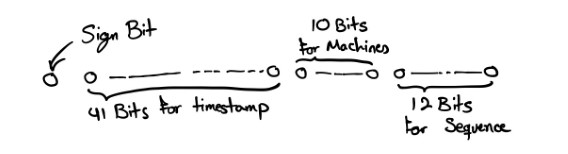 The first 10 are used as machine bits. Each machine will be assigned a number at the start that is unique to that machine, and can’t overlap with any other running machine. This can either be hardcoded to each server or be read from a shared database at the startup. Using these 10 bits should allow us to have 1024 (2^10) nodes running at the same time. The next 12 bits are considered the sequential bits counted in every millisecond. This would give us 4096 IDs per millisecond, per node. But these bits can be switched around accordingly to achieve a more vertical or horizontal design as well.